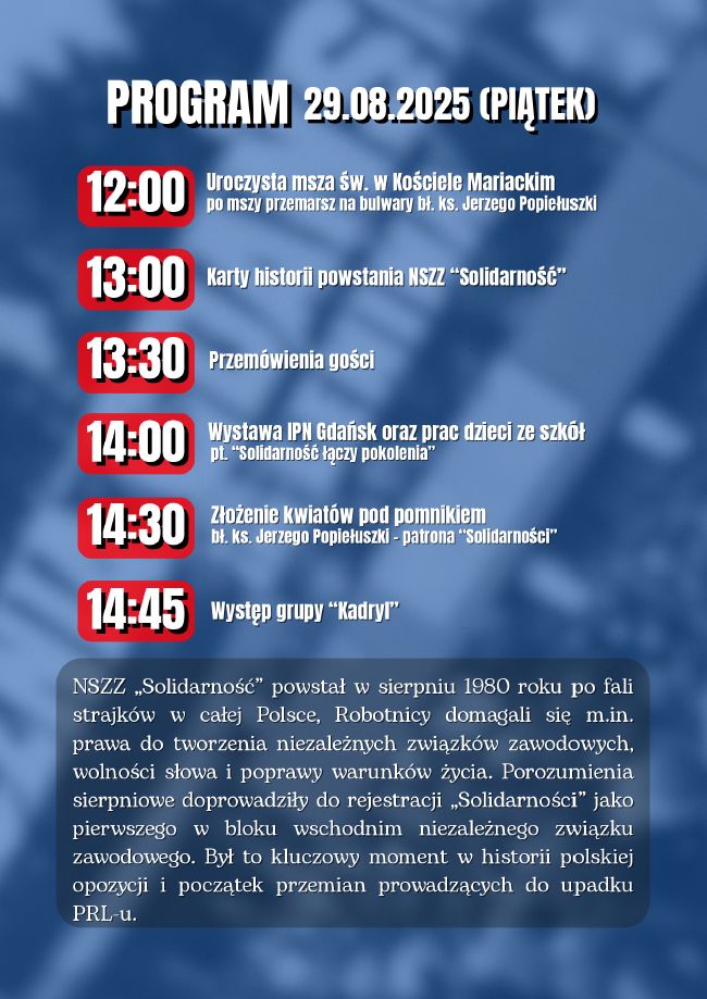 W związku z 45-leciem "Solidarności" Zarząd Regionu Słupskiego wraz z Sekcją Regionalną OiW zaprasza do udziału w konkursie organizowanym dla szkół podstawowych i ponadpodstawowych pt. "Solidarność łączy pokolenia". 🙂 Pragniemy aby konkurs stał się okazją nie tylko do współzawodnictwa ale również do tego aby na nowo odkryć podstawowe prawdy i wartości, które stanowią fundament Solidarności❤️ Serdecznie zapraszamy do wzięcia udziału w konkursie.