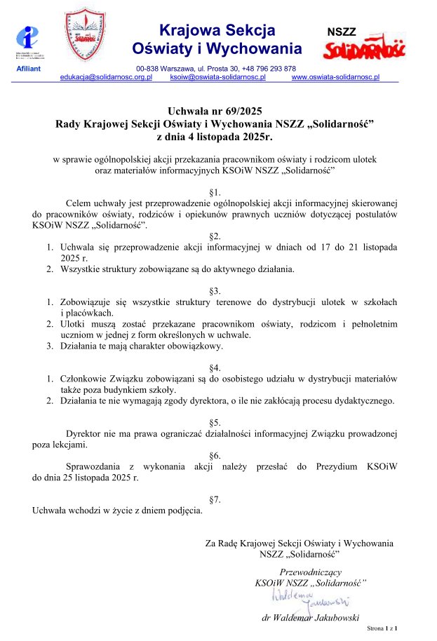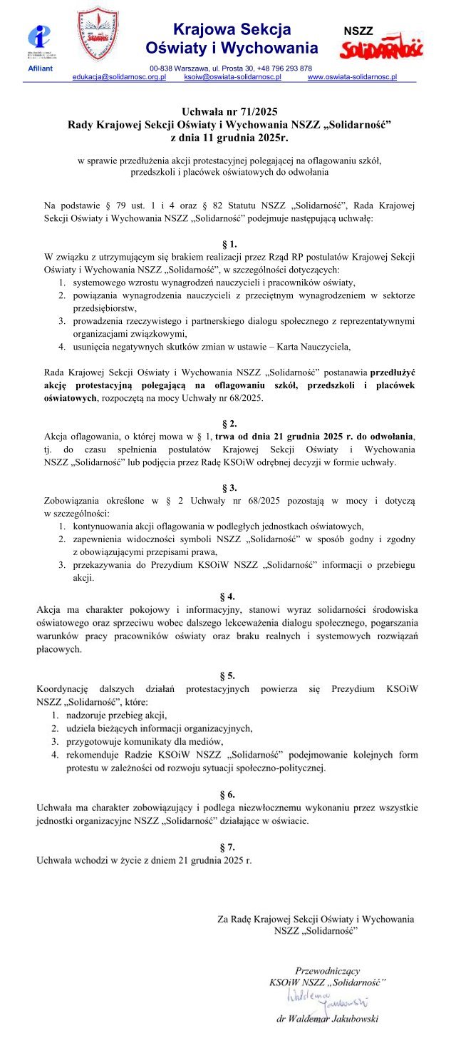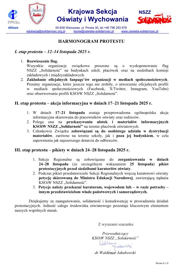 Dziś, 12 listopada, rozpoczynamy kolejną akcję protestacyjną – oflagowanie szkół i placówek oświatowych w całej Polsce. Flagi „Solidarności” to nasz czytelny znak sprzeciwu wobec lekceważenia postulatów środowiska oświatowego oraz braków w dialogu z rządem. To kolejne kroki naszych działań: